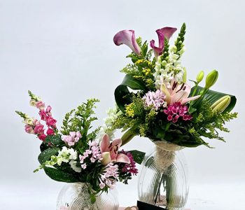 עיצוב 2 אגרטלי זכוכית מיני בשילוב פרחים חיים